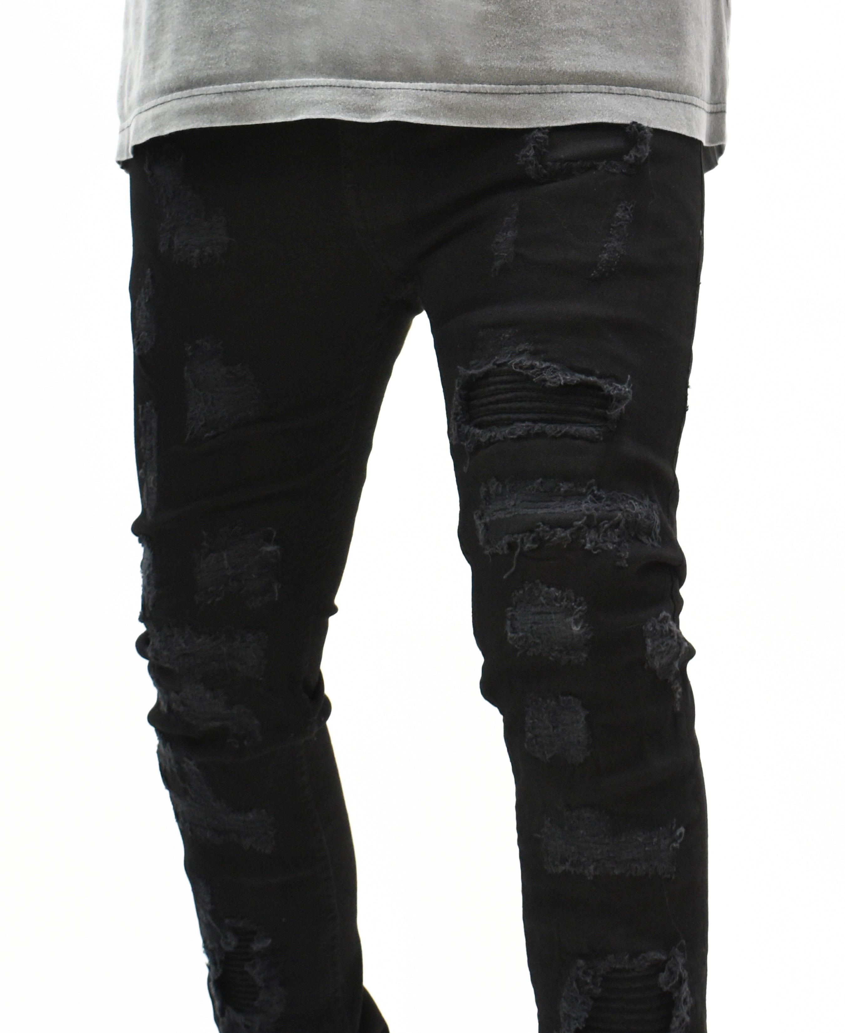 ★ Distressing and moto-biker gashes throughout.